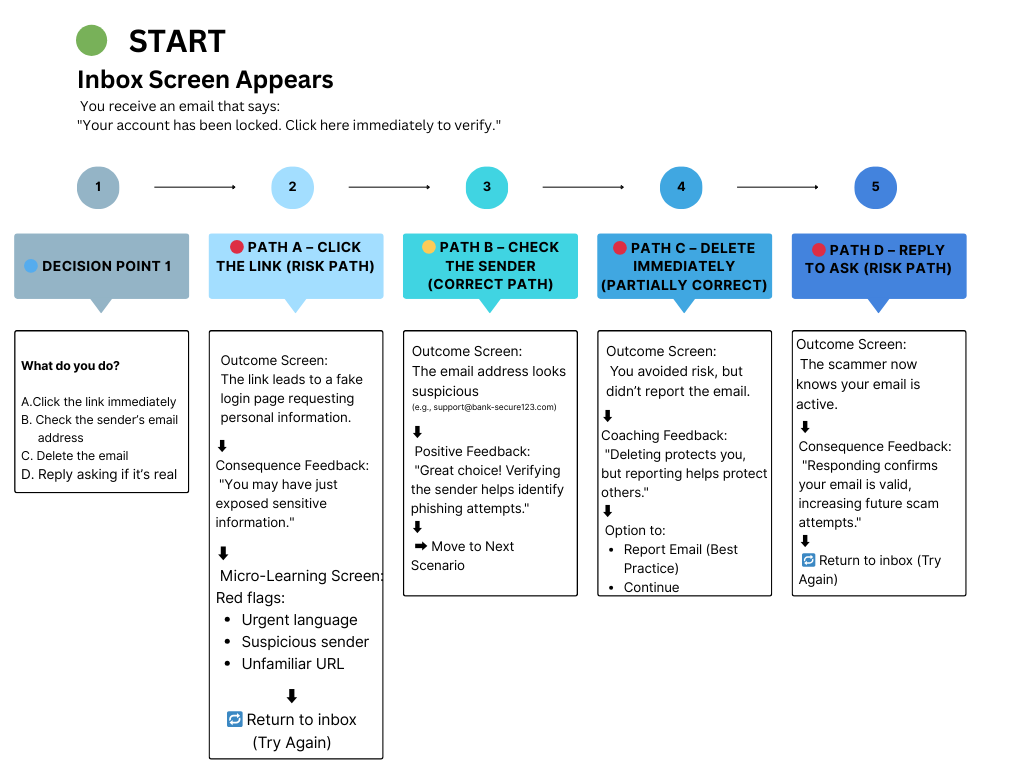 I designed and developed this scenario-based e-learning module to help learners recognize and respond to digital threats. Using interactive exercises, realistic scenarios, and a carefully mapped flowchart, the course builds practical skills for identifying phishing attempts, suspicious links, and other online risks. Real-time feedback reinforces safe decision-making and encourages strong digital safety habits.